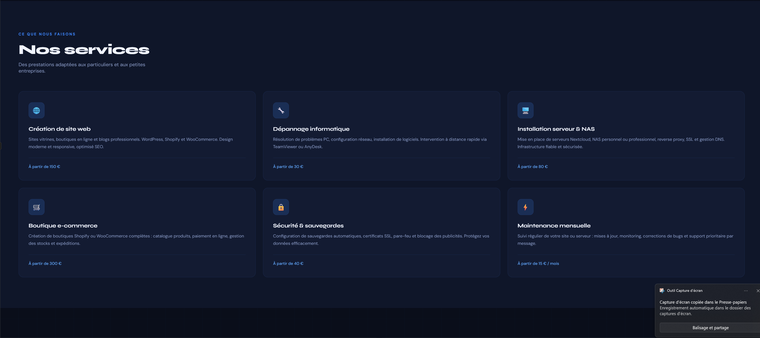Passionné d'informatique avec plusieurs années d'expérience, je propose des services de création de sites web (WordPress, Shopify), de dépannage informatique à distance et d'installation de serveurs (NAS, Nextcloud, etc.). Je travaille uniquement en ligne, avec des réponses rapides par message. Mon objectif : des solutions simples, efficaces et sans prise de tête pour vous.