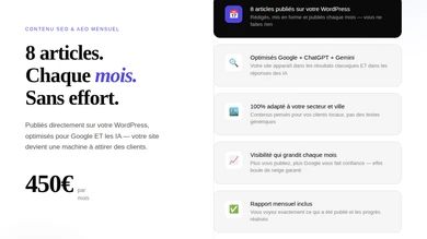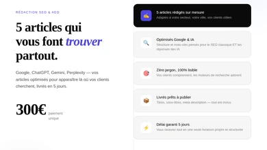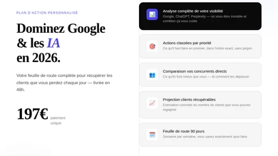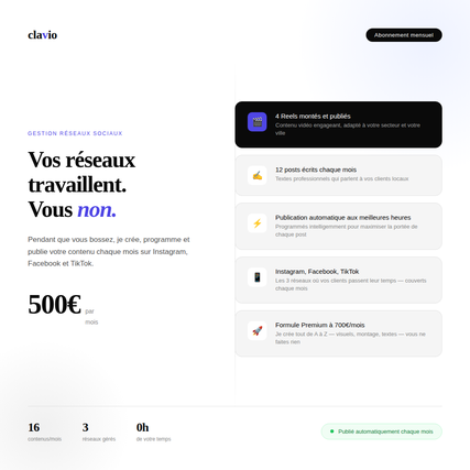 Je suis Gabriel, fondateur de Clavio.fr. J'aide les commerces et PME françaises à être trouvés sur Google ET sur les IA comme ChatGPT, Gemini ou Perplexity. Parce qu'en 2026, si vous n'apparaissez pas quand une IA répond à vos futurs clients — vous perdez des ventes chaque jour sans le savoir. Mon approche : pas de jargon, pas de promesses vides. Des résultats concrets, mesurables, livrés en 48h à 5 jours. Ce que je fais concrètement : — Audit de visibilité Google + IA en 48h Vous recevez un rapport clair avec vos pertes chiffrées et un plan d'action prioritaire — Contenus SEO & AEO qui attirent des clients qualifiés Articles optimisés pour Google ET pour les réponses des IA — votre nom apparaît là où vos clients cherchent — Gestion réseaux sociaux automatisée Posts créés, programmés et publiés chaque mois — vous ne faites rien — Chatbot IA installé sur votre site Il répond à vos clients, capte des leads et travaille à votre place 24h/24 Des dizaines de commerces français ont déjà récupéré des clients qu'ils perdaient sans le savoir. A votre tour.