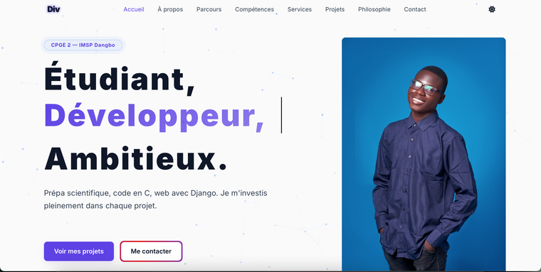 🤩 Je m'appelle Divin, développeur web et créateur de contenu visuel avec +2 années d'expérience en développement et en design. Je conçois des portfolios clairs, modernes et adaptés à votre profil, image, PDF ou site web.