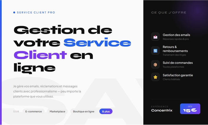 Bonjour ! Je suis conseiller client professionnel avec une expérience solide chez Concentrix sur le projet Amazon. Je suis habitué à gérer des demandes clients variées, à traiter des réclamations et à assurer un suivi rigoureux des dossiers. Je peux vous aider à : • Gérer vos emails clients • Répondre aux messages et réclamations • Assurer le suivi de vos commandes et dossiers clients • Modérer vos réseaux sociaux Je suis sérieux, réactif et orienté satisfaction client. N’hésitez pas à me contacter pour discuter de vos besoins !