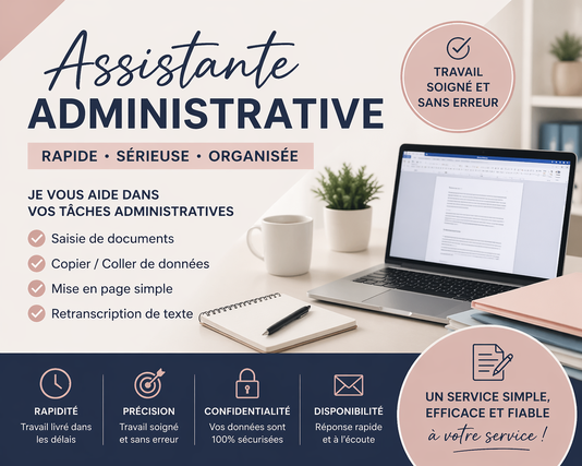 Je vous propose mon aide pour vos tâches administratives simples et rapides. Sérieuse, organisée et motivée, je peux vous aider dans : ✔️ La saisie de documents (Word, texte) ✔️ Le copier / coller de données ✔️ La mise en page simple de documents ✔️ La retranscription audio en texte ✔️ Les petites tâches administratives Je travaille avec soin et je m’engage à fournir un travail propre et dans les délais. Disponible rapidement, je reste à votre écoute pour toute demande.