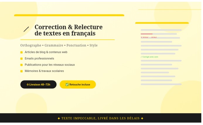 Je lis attentivement chaque texte et corrige toutes les erreurs d'orthographe, de grammaire, de conjugaison, de ponctuation et de syntaxe — tout en préservant votre style.