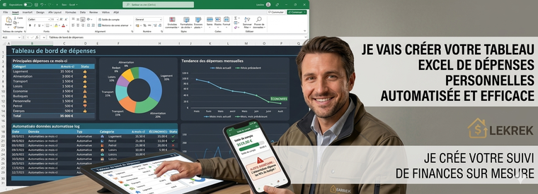 Je vous propose la création d’un tableau Excel automatisé de suivi des dépenses personnelles, conçu pour vous aider à mieux gérer votre budget au quotidien de manière simple et efficace.