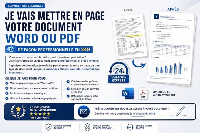 Ingénieur de formation, je maîtrise parfaitement la mise en page de tout type de document : rapports, mémoires, thèses, contrats, présentations, brochures...