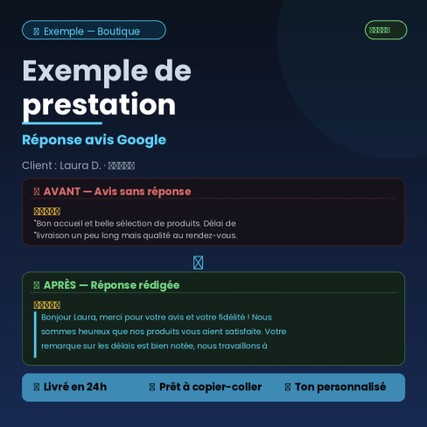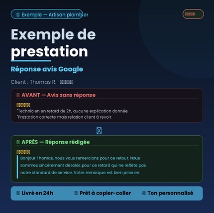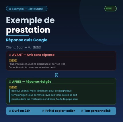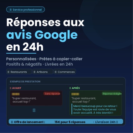 Je rédige des réponses professionnelles, personnalisées et humaines à vos avis Google positifs ET négatifs. Chaque réponse est adaptée à votre secteur d'activité et à votre ton. Vous n'avez plus qu'à copier-coller directement sur votre fiche Google.