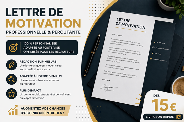 Je vous propose une lettre de motivation professionnelle, personnalisée et adaptée au poste visé, pour maximiser vos chances d’obtenir un entretien.