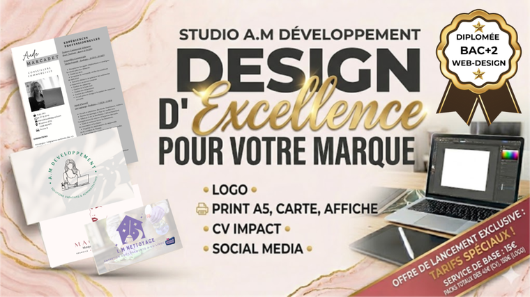 Bonjour ! Je suis Aude, fondatrice de A.M Développement. 🎨 Diplômée d'un Bac+2 en Web Design, j'allie rigueur technique et créativité pour donner vie à vos projets. Après avoir consolidé mes compétences en design d'interface et identité visuelle, je me lance aujourd'hui en freelance pour offrir aux entrepreneurs des visuels de haute qualité. Pourquoi me faire confiance ? Parce que je ne me contente pas de faire du 'joli' : je conçois des designs pensés pour le web et l'impression, avec la précision de ma formation technique. Profitez de mes tarifs de lancement pour booster votre image! Portfolio en cours d'enrichissement. Profitez de tarifs de lancement exclusifs !" Cela explique pourquoi il y a peu de photos et transforme ton manque d'historique en un avantage prix pour le client.