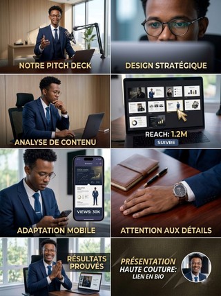 Que vous soyez face à des investisseurs, des partenaires stratégiques ou vos futurs clients, votre support visuel est le reflet de votre sérieux. Une présentation médiocre peut ruiner une idée brillante. Je conçois pour vous des Pitch Decks et des présentations professionnelles qui captivent l'attention et renforcent votre autorité.