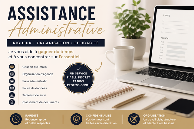 Rigoureuse, organisée et réactive, je propose mes services d’assistance administrative pour aider les professionnels, entrepreneurs et indépendants à gagner du temps et à alléger leur charge de travail. Gestion d’e-mails, organisation d’agenda, suivi administratif, création de tableaux de suivi, saisie de données, classement de documents, support quotidien : je m’adapte à vos besoins avec sérieux et discrétion. Mon objectif est simple : vous permettre de vous concentrer sur l’essentiel pendant que je prends en charge l’organisation et les tâches administratives qui demandent du temps et de la rigueur. Je travaille avec professionnalisme, confidentialité et efficacité, en veillant toujours à fournir un travail clair, structuré et fiable. Disponible pour des missions ponctuelles comme pour des collaborations régulières.