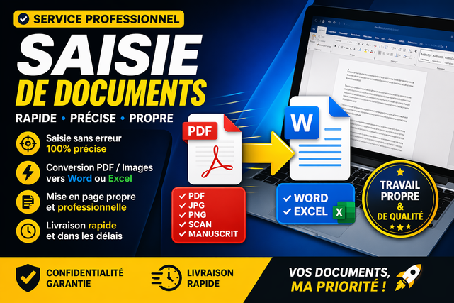 Je prends en charge la saisie de vos contenus avec une grande attention aux détails, tout en respectant la mise en forme d’origine ou en l’améliorant pour un rendu plus clair et lisible. Chaque document est soigneusement organisé afin d’être prêt à l’utilisation.