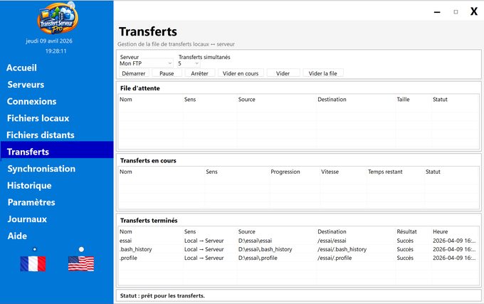 bon moment. La file de transferts distingue clairement ce qui est en attente, ce qui est en cours et ce qui est terminé.
