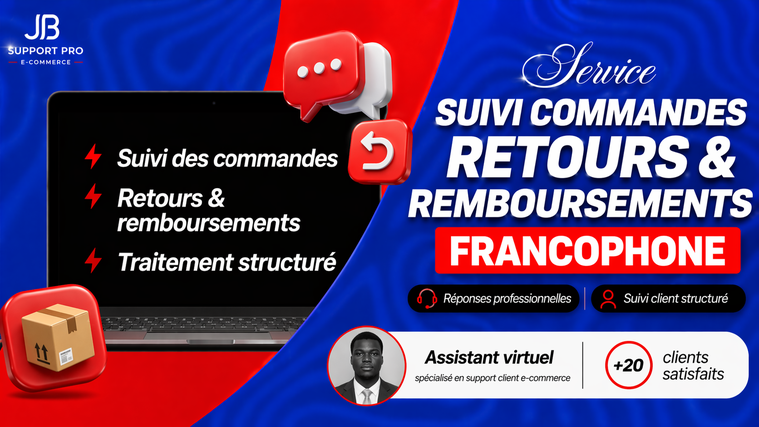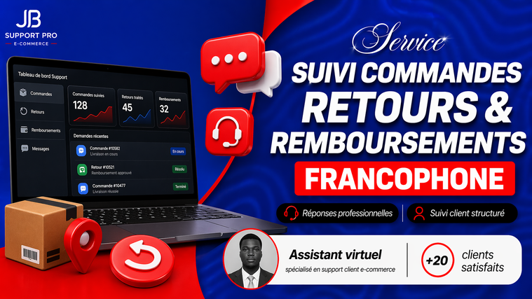 Je vous propose de prendre en charge le suivi des commandes, les demandes de retour, les remboursements et les annulations de votre boutique e-commerce avec sérieux, rigueur et professionnalisme, afin de vous aider à offrir une meilleure expérience à vos clients tout en vous libérant du temps pour développer votre activité.