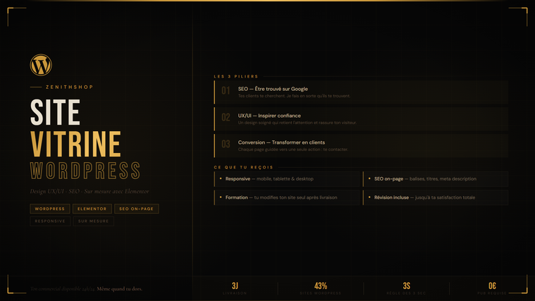 Un site vitrine, c'est ta présence officielle sur internet. C'est la première chose que ton client potentiel regarde avant de te faire confiance. Avant de t'appeler. Avant d'acheter. Avant de te recommander. Aujourd'hui, ne pas avoir de site vitrine professionnel c'est comme avoir un commerce sans devanture. Les gens passent devant et continuent leur chemin.