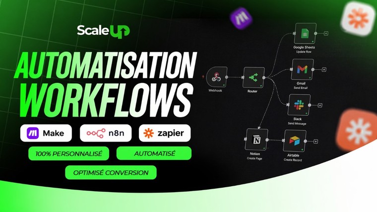 Chez Scale_UP, je mets en place des systèmes d'automatisation sur mesure avec Make, n8n ou Zapier — pour que tout ce qui peut tourner seul… tourne seul. Vous gardez le contrôle sur la stratégie, je m'occupe du reste.