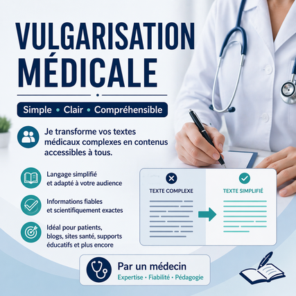 En tant que médecin, je vous aide à simplifier et vulgariser vos contenus médicaux pour les rendre clairs, accessibles et agréables à lire.