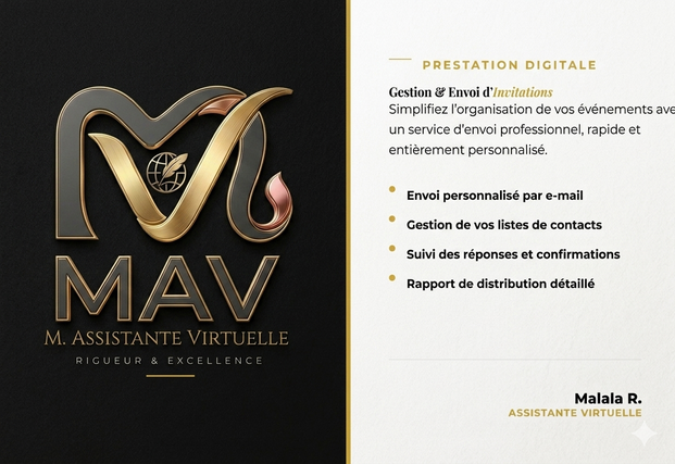 Que ce soit pour un usage professionnel (conférence, réunion, lancement) ou événementiel (cérémonie, gala), la première impression passe par l'invitation. Sous l'enseigne MAV (M. Assistante Virtuelle), j'allie rigueur et excellence pour assurer une diffusion parfaite.