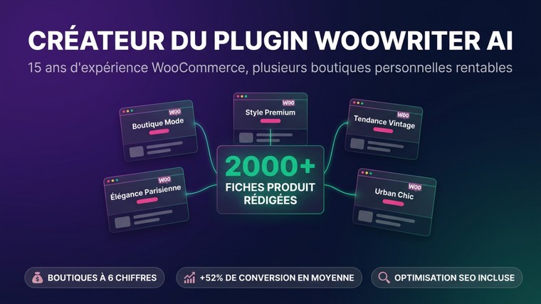 Je rédige des fiches produit WooCommerce qui combinent psychologie de vente, optimisation SEO et structure copywriting éprouvée. 15 ans d'expérience en e-commerce, créateur du plugin WooWriter AI utilisé par des centaines de boutiques, et plusieurs e-shops personnels rentables (mon-poncho.fr, tendance-retro.fr, combinaison-femme.fr).