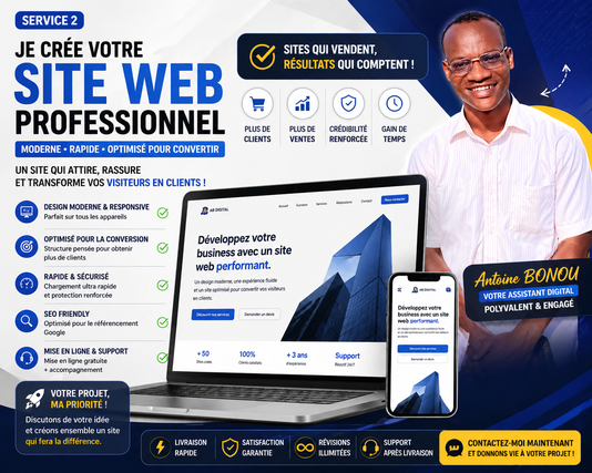 Je suis Antoine BONOU, assistant virtuel multi-compétences avec 1 à 3 ans d'expérience terrain sur des projets web, visuels, vidéo et éditoriaux. Ma valeur unique sur le marché ? Je couvre l'intégralité de la chaîne de création digitale — du site web au contenu, de l'identité visuelle à la vidéo — avec une vision globale et une exécution cohérente. Je travaille avec des entrepreneurs solo preneurs, des PME en croissance, des agences qui sous-traitent, des boutiques e-commerce et des créateurs de contenu qui ont besoin d'un partenaire de confiance, réactif et polyvalent.