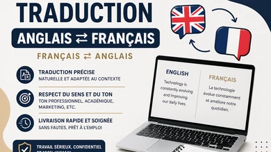 Ingénieure en robotique de formation, j’ai développé tout au long de mon parcours académique — jusqu’à l’obtention de mon diplôme — des compétences solides en analyse, rigueur rédactionnelle et maîtrise des langues. Au-delà de mon domaine technique, j’ai acquis une véritable aisance en traduction anglais ↔ français (EN ⇄ FR) ainsi qu’en rédaction de contenus clairs, structurés et précis. Ces compétences, ainsi que ma passion pour l'écriture et le dessin, me permettent aujourd’hui de proposer des services fiables et de qualité, adaptés aux besoins de chacun. Je mets désormais mon savoir-faire au service des particuliers et des professionnels sur ComeUp, avec pour objectif de fournir un travail sérieux, soigné et respectant les délais. Je propose notamment : Traduction anglais vers français (EN → FR) Traduction français vers anglais (FR → EN) Rédaction de contenus Reformulation et correction de textes Création de logo Je m’engage à vous accompagner avec professionnalisme, efficacité et confidentialité. N’hésitez pas à me contacter pour discuter de votre projet !
