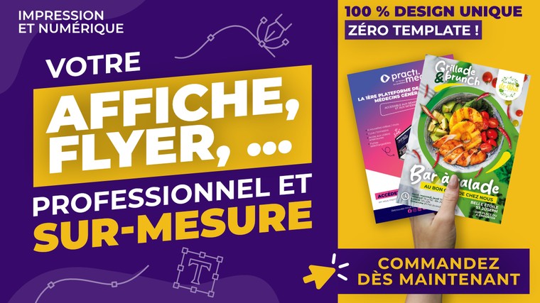 | PACK Affiche ou RECTO 58,71 $US | 🌟 PACK flyer / plaquette RECTO-VERSO 82,19 $US | PACK dépliant A4 ouvert 93,93 $US |