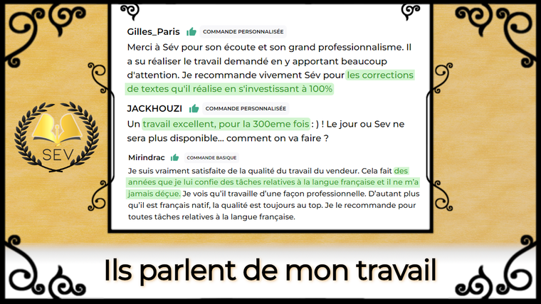 Merci infiniment pour ce bel avis ainsi que cette précieuse collaboration Julien ! Je suis enchanté, mais aussi honoré, que vous ayez été sensible au degré d’exigence qui habite chacune de mes corrections. C’était un plaisir de mettre mes compétences et mon engagement au service d’un projet si prometteur et qualitatif que le vôtre. Le sérieux de votre démarche ainsi que votre sens du travail soigné ont fait de cette commande un challenge enthousiasmant ! Je n'ai aucun doute sur le fait que votre livre rencontrera le succès qu'il mérite et aidera de nombreuses personnes. Dans l’espoir de vous revoir bientôt pour la suite, bonne continuation à vous Julien 🌞 Sév.